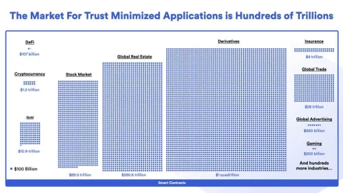 Infografika prikazuje tržište povjerenja minimiziranih aplikacija, s kvadratima u plavoj boji koji predstavljaju vrijednosti pojedinih sektora. Prikazani su manji segmenti poput DeFi-a i kriptovaluta, dok nasuprot njima izbijaju globalna imovina, derivati i tržište dionica.
