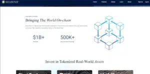 Screenshot web stranice Securitize, koja nudi tokenizaciju stvarnih imovine. Prikazuju se logo tvrtke, navigacijski izbornik, ključna izjava Bringing The World On-chain, važna statistika o više od milijardu dolara na platformi i 500.000 računa te prilike za ulaganje u tokenizirane imovine.