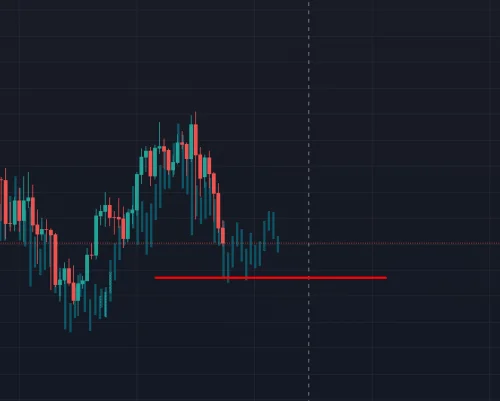 Grafikon svijećnjaka na tamnoj pozadini prikazuje kretanje cijena dionica. Zelene i crvene svijeće ocrtavaju uzlazni i silazni trend, s ključnom crvenom linijom podrške za analizu tržišta.