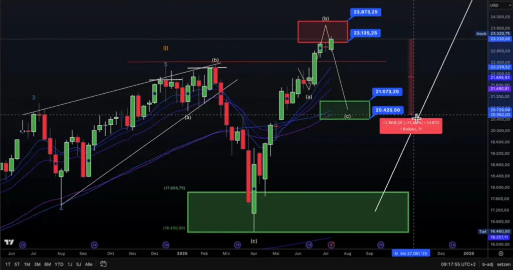 • Završena struktura: Talas (III), očekuje se korektivni (a)-(b)-(c) pad prema zoni 20.425–21.073