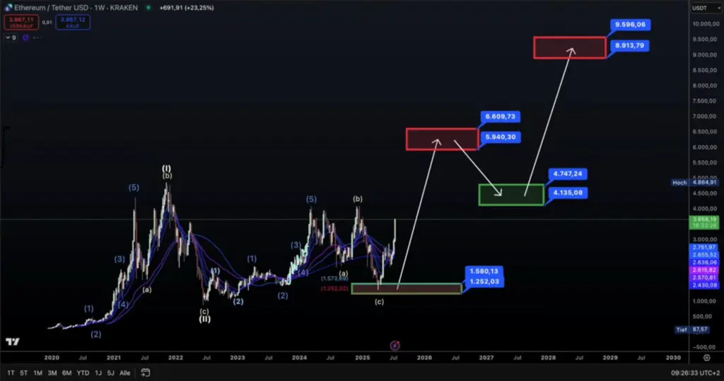 • Komentar: ETH formira impulsivni talas u okviru Elliott Wave strukture (5-3-5). Ukoliko se trenutni zamah održi, očekuje se probijanje gornje zone ka 6.000+. Međutim, korekcija prema 4.100 USDT je vjerovatna prije nastavka rasta.