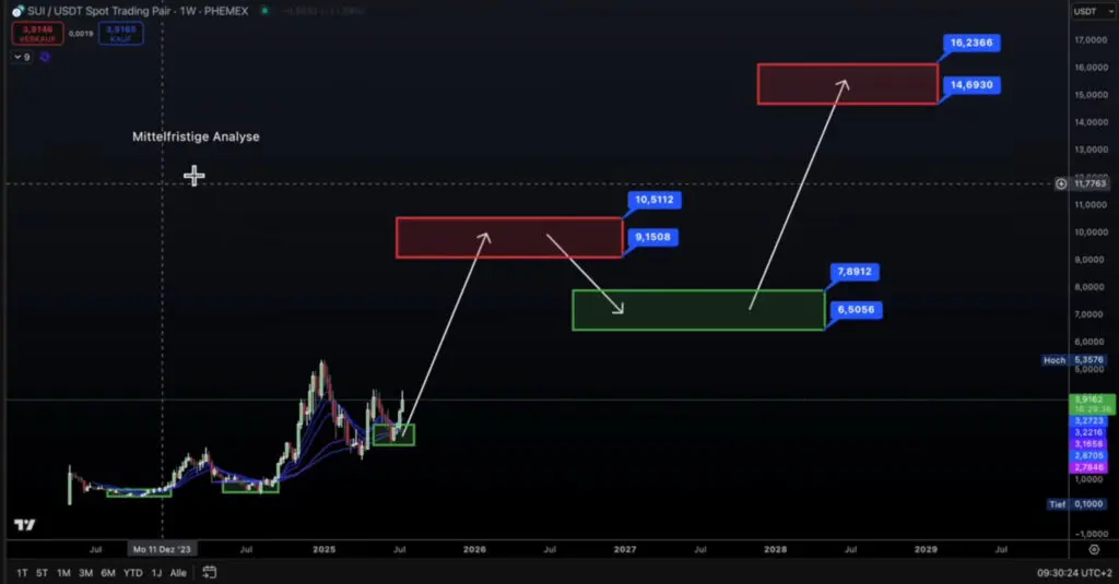 • Komentar: SUI se nalazi u srednjoročnoj zoni konsolidacije. Ako se ne desi pad ispod 6.5 USDT, put ka 10+ USDT je moguć. Zdrav tehnički oblik grafikona sa potencijalom za duži rast.