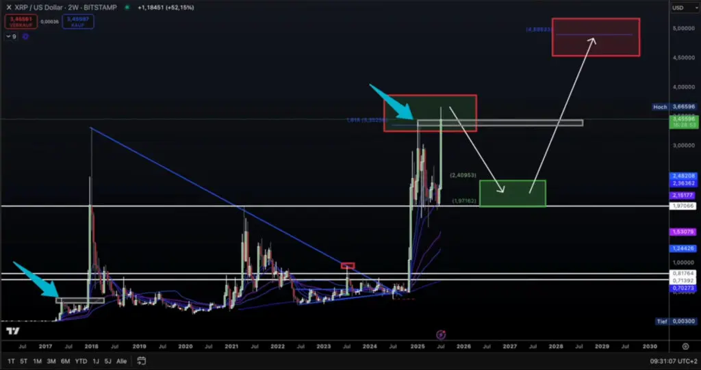 • Komentar: XRP se nalazi u fazi eksplozije nakon konsolidacije. Fibonacci meta od 1.618 na 3.95 je skoro dotaknuta. Ukoliko se probije, 4.89 postaje novi magnet za cijenu. U suprotnom, moguća korekcija prema ~2 USDT.