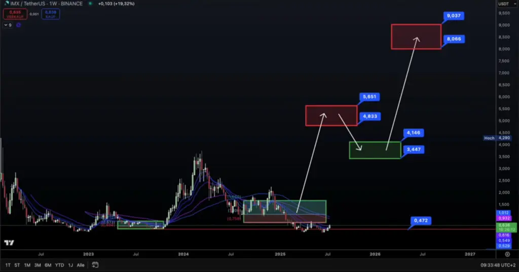 • Komentar: IMX se nalazi na dnu dugoročne zone. Trenutna cijena ukazuje na mogućnost 10x rasta ako se prepozna kao ekosistem layer 2 lidera.