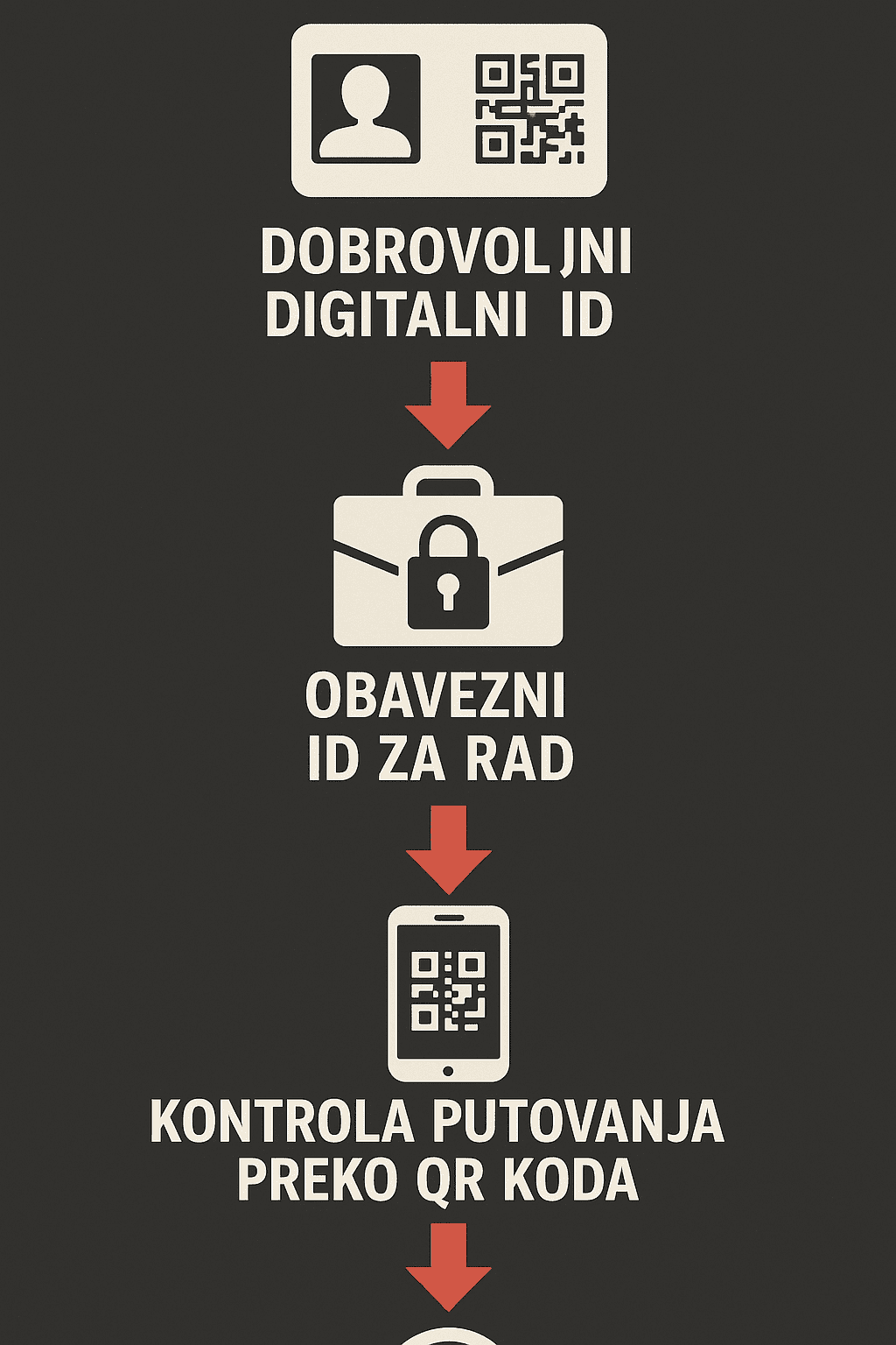 Vertikalna infografika na tamnoj pozadini ilustrira progresiju digitalnog ID-a: od dobrovoljnog digitalnog ID-a, preko obaveznog za rad, do kontrole putovanja QR kodom.