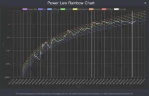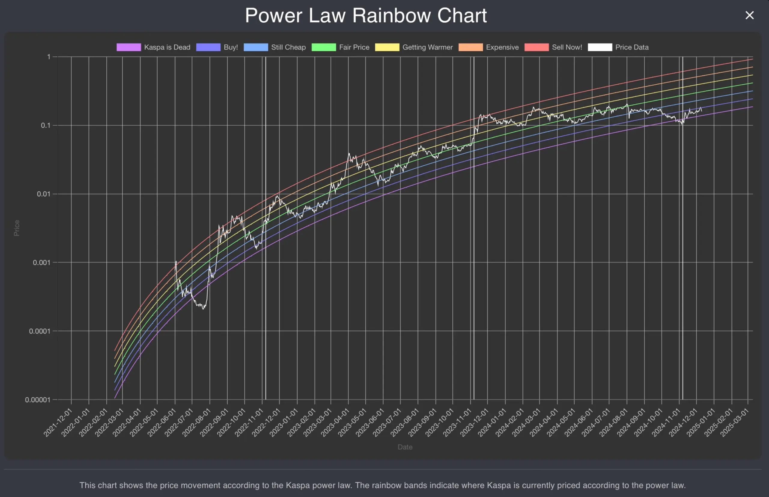 Grafikon prikazuje cijene kriptovalute Kaspa, s logaritamskom skalom na Y-osi i vremenom na X-osi. Raznobojni pojasevi označavaju vrijednosti prema moćnom zakonu, uz bijelu liniju koja prati povijesne cijene kroz razne vrijednosne oznake od Kupnja! do Prodaj sada!.
