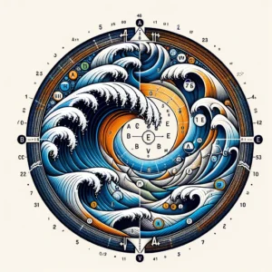 Umjetnička mandala Valovi i kompas prikazuje dinamične oceanjske valove u tonovima plave i bijele, inspirirane japanskim stilom. Okruženi su preciznim simbolima i brojevima kompasa, stvarajući sklad između prirodne nesigurnosti mora i strukture navigacije.
