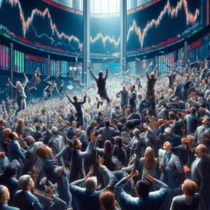 Živahni trgovački pod na burzi ispunjen je energičnim trgovcima u odijelima koji intenzivno komuniciraju, mašući telefonima i notepadima. Veliki digitalni ekrani prikazuju dinamične grafove i promjene cijena, stvarajući dinamičnu atmosferu punu trgovinskog uzbuđenja.