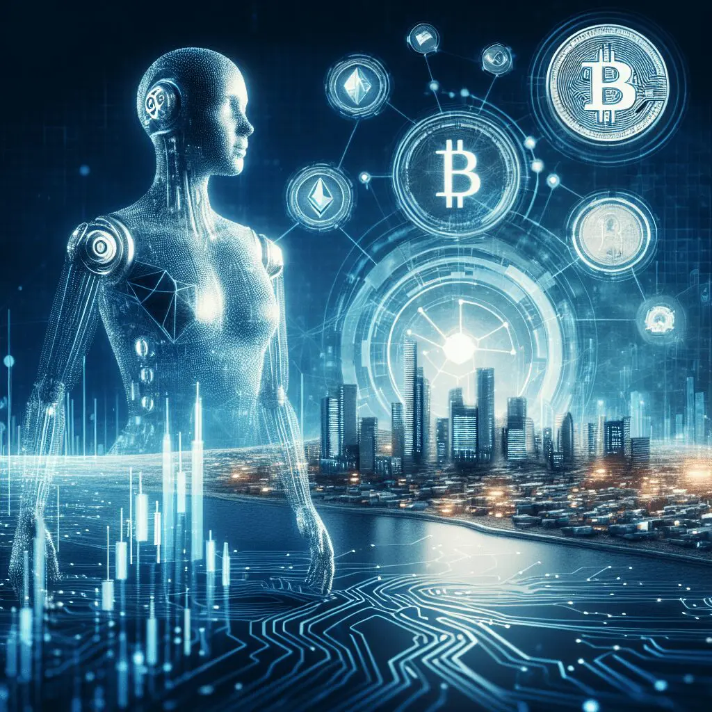 Futuristička scena prikazuje humanoidnog robota sa sjajnom, metalnom površinom u dinamičnom gradskom krajoliku. Osvijetljeni neboderi i simboli Bitcoina ističu povezanost umjetne inteligencije i kriptovaluta, simbolizirajući transformaciju modernog financijskog svijeta.