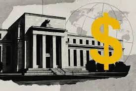Neoklasična zgrada s kolonadom i orlom na vrhu, ispred velik žuti simbol dolara, a u pozadini obrisi globusa, simbolizirajući snagu financijskih institucija i njihov globalni ekonomski utjecaj.