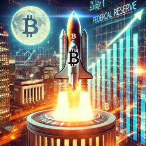 Slika prikazuje raketu s Bitcoin simbolom koja uzlijeće prema Mjesecu, simbolizirajući rast kriptovaluta. U pozadini se vide moderni poslovni neboderi i graf rasta, dok plamenovi i dim ističu energičan uspon Bitcoina u svijetu financija.