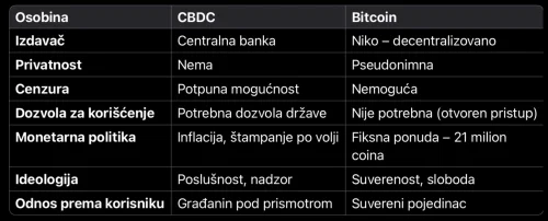 Tablica uspoređuje karakteristike CBDC-a i Bitcoina: izdavač, privatnost, cenzura, dozvola, monetarna politika i ideologija. CBDC je centraliziran s potpunom kontrolom, dok je Bitcoin decentraliziran, pseudoniman, bez cenzure i promovira slobodu.