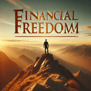 Čovjek stoji na vrhu planine u zoru, silueta simbolična za postignuće. Sunčeve zrake obasjavaju planinske vrhove, ističući tekst FINANCIJSKA SLOBODA u toplim tonovima na nebu, naglašavajući temu osnaženja i neovisnosti.