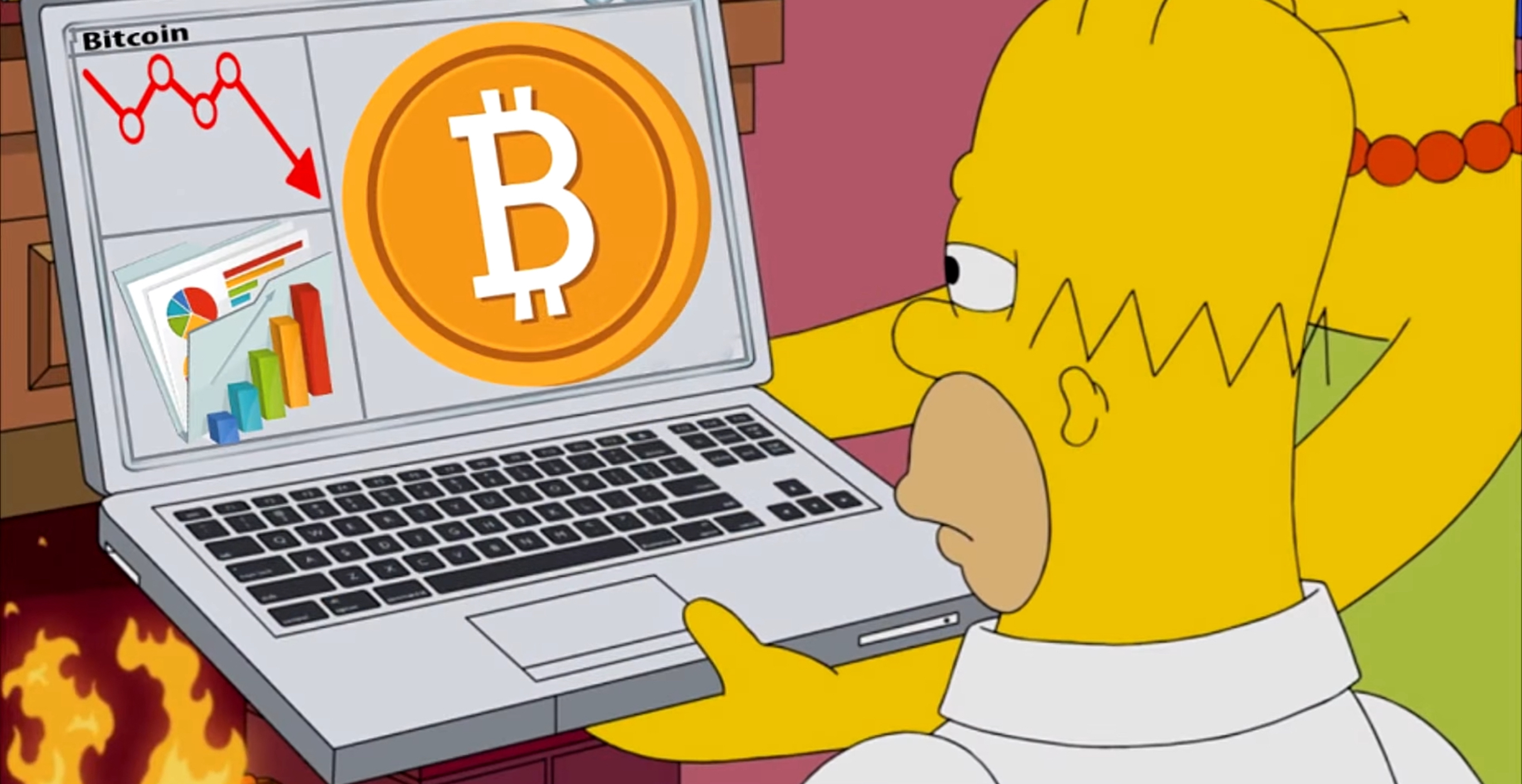 Animirani lik sa žutom kožom i zabrinutim izrazom lica drži laptop s prikazom Bitcoina u padu. U pozadini je dio doma s kaminom, a drugi lik u zelenoj haljini. Ekran pokazuje grafikone o tržištu, naglašavajući sukob svakodnevice i kriptovaluta.