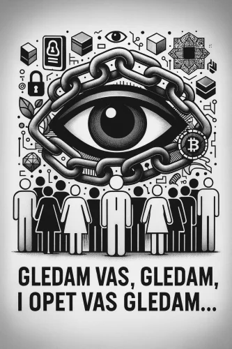 Crno-bijela slika prikazuje oko okovano lancem koje nadzire simbole digitalnog doba, privatnosti i kriptovaluta, dok ispod stoje ljudi uz poruku GLEDAM VAS….