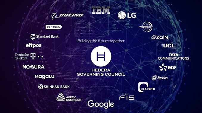 Hedera Governing Council: global collaboration with IBM, Google, Deutsche Telekom logos, blockchain network.
