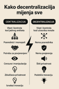 Infografika uspoređuje centralizaciju i decentralizaciju prikazujući razlike u kontroli, privatnosti, inovacijama i ulozi posrednika uz jasne ikone i grafičku podjelu između dvaju sustava.
