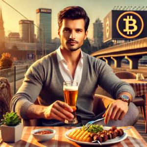 Muškarac sjedi u vanjskom kafiću, opušteno držeći pivo, spreman uživati u obroku od mesa i povrća na stolu s kariranim stolnjakom. U pozadini je moderno gradsko okruženje s plakatom za Bitcoin, dok zalazak sunca obasjava scenu toplim sjajem.