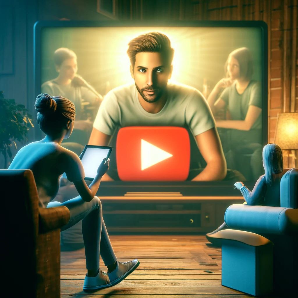Cozy dnevni boravak osvijetljen je toplim svjetlom, gdje obitelj uživa u večernjem gledanju. Na TV-u se prikazuje mladić s kratkom frizurom, dok jedna osoba na sofi koristi tablet, a druga zauzima fotelju, radoznalo prateći sadržaj. Atmosfera je opuštajuća i moderni digitalni trenuci.