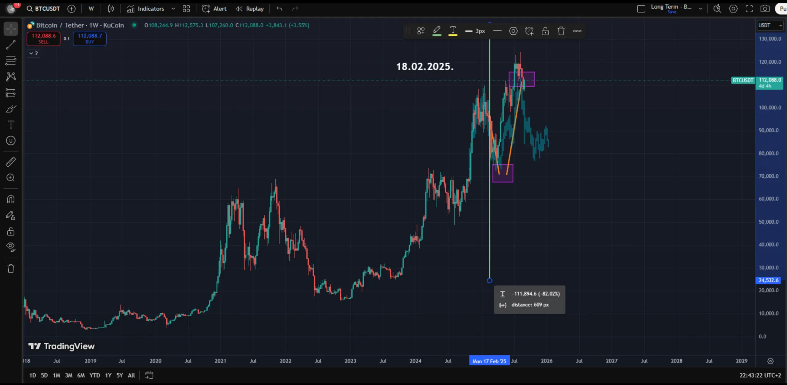 Tjedni grafikon BTC/USDT na KuCoinu prikazuje kretanje cijene Bitcoina, uzlazne trendove, volatilnost i analizu s linijama, kutijama i datumom 18.02.2025.