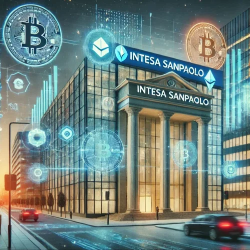 Slika prikazuje gradski pejzaž s impozantnom zgradom Intesa Sanpaolo, koja kombinira klasičnu arhitekturu s modernim digitalnim elementima, uključujući holograme kriptovaluta u nebu. Osvjetljenje stvara hladan kontrast, naglašavajući spoj tradicionalnog bankarstva s digitalnim inovacijama.