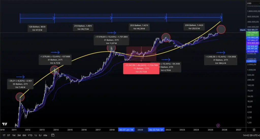 Sve to možete jasno vidjeti i pratiti na grafikonu iznad, gdje se ponavlja ciklični obrazac iz 2013, 2017. i 2021. godine – i gdje logaritamski kanal i vremenska simetrija precizno ukazuju na potencijalni kraj ove euforične faze.