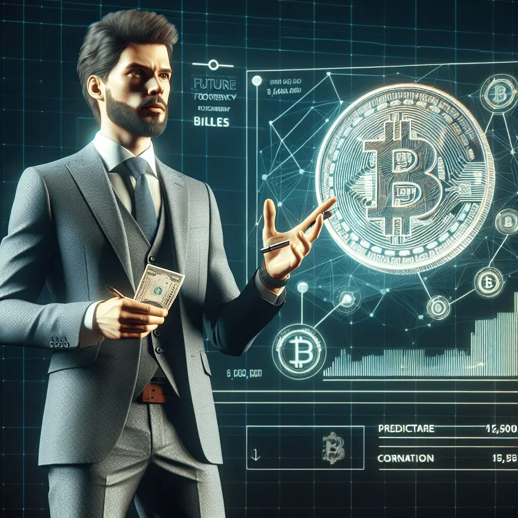 Na slici se nalaze samouvjereni muškarac u svijetlom odijelu koji drži dolar i gestikulira dok diskutira o financijama. Iza njega blista Bitcoin, okružen modernim financijskim grafikonima i digitalnim podacima, simbolizirajući spoj tradicionalnih i digitalnih investicija.