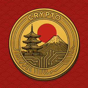 Stilizirani kripto novčić s japanskom temom prikazuje tradicionalnu pagodu i planinu Fuji, dok crveno sunce evocira japansku zastavu. Moderni digitalni elementi ugravirani su ispod, spajajući tradiciju i tehnologiju. Pozadina je crvena s valovitim uzorkom.