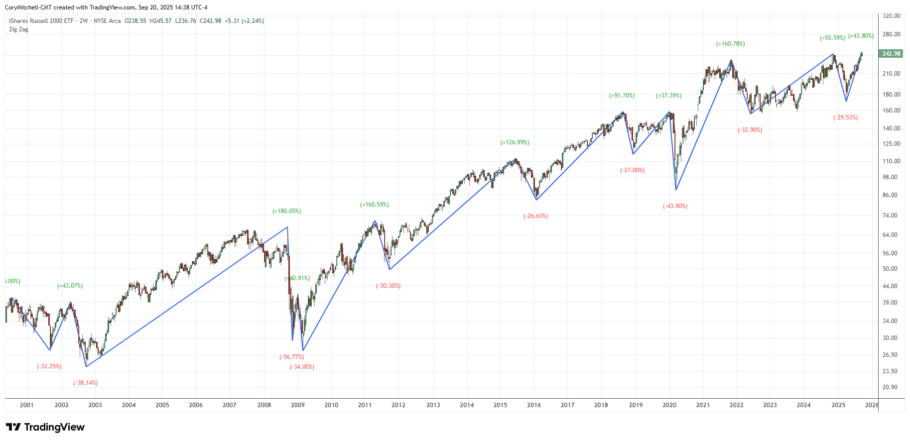 Linijski grafikon IWM Russell 2000 ETF-a (2001.-2026.) prikazuje cijenu, uz Zig Zag postotke rasta i pada, naglašavajući dugoročni uzlazni trend i volatilnost tržišta.