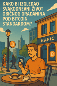 Urbana scena prikazuje muškarca koji sjedi u kafiću s pametnim telefonom koji ima Bitcoin simbol na ekranu. Opušteno odjeven u narančastu majicu, uživa u palačinkama i kavi. Oko njega su prolaznici, zgrade i stup s Bitcoin simbolom, sugerirajući integraciju kriptovaluta u svakodnevni život.