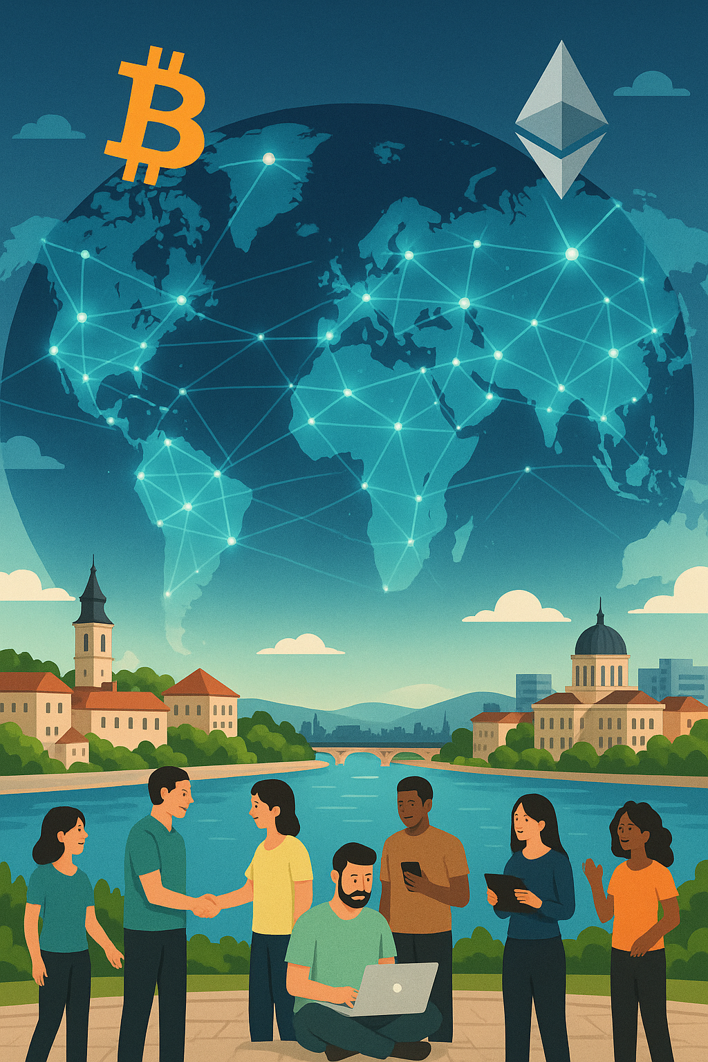 Digitalna ilustracija prikazuje globalnu povezanost kroz tehnologiju i kriptovalute. Gornji dio slike prikazuje Zemlju s mrežom linija, uz simbole Bitcoina i Ethereuma. U prvom planu ljudi koriste uređaje, simbolizirajući digitalnu interakciju.