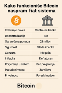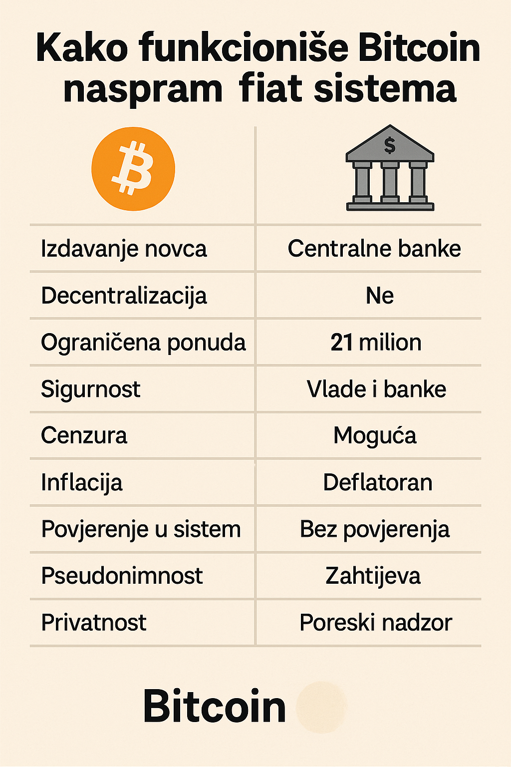 Infografika na hrvatskom jeziku uspoređuje Bitcoin i fiat novac kroz kategorije poput decentralizacije, sigurnosti, inflacije i privatnosti, koristeći ikone i tablicu s jasnim razlikama između ova dva monetarna sustava.