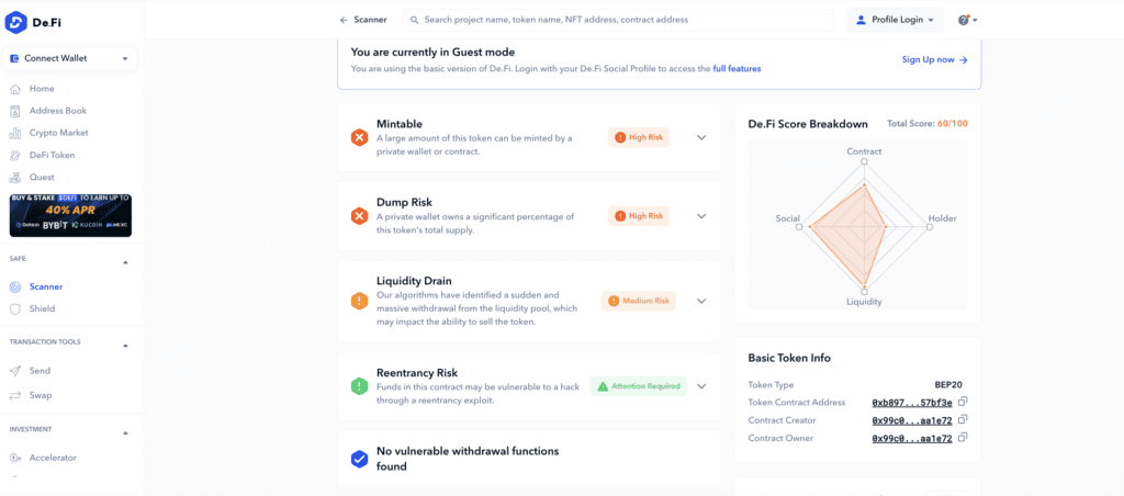 Zatim odete na DEFI i tu pogeldate stanje istoga tokena dali je high rizik ili je ok. Meni je jako važan podatak ako je tu dosta opasno ja više niti ne gledam dalje ako vam je tu sve ok i sve je prošlo kako treba krenem gledati dalje natrag na whitepaper.
