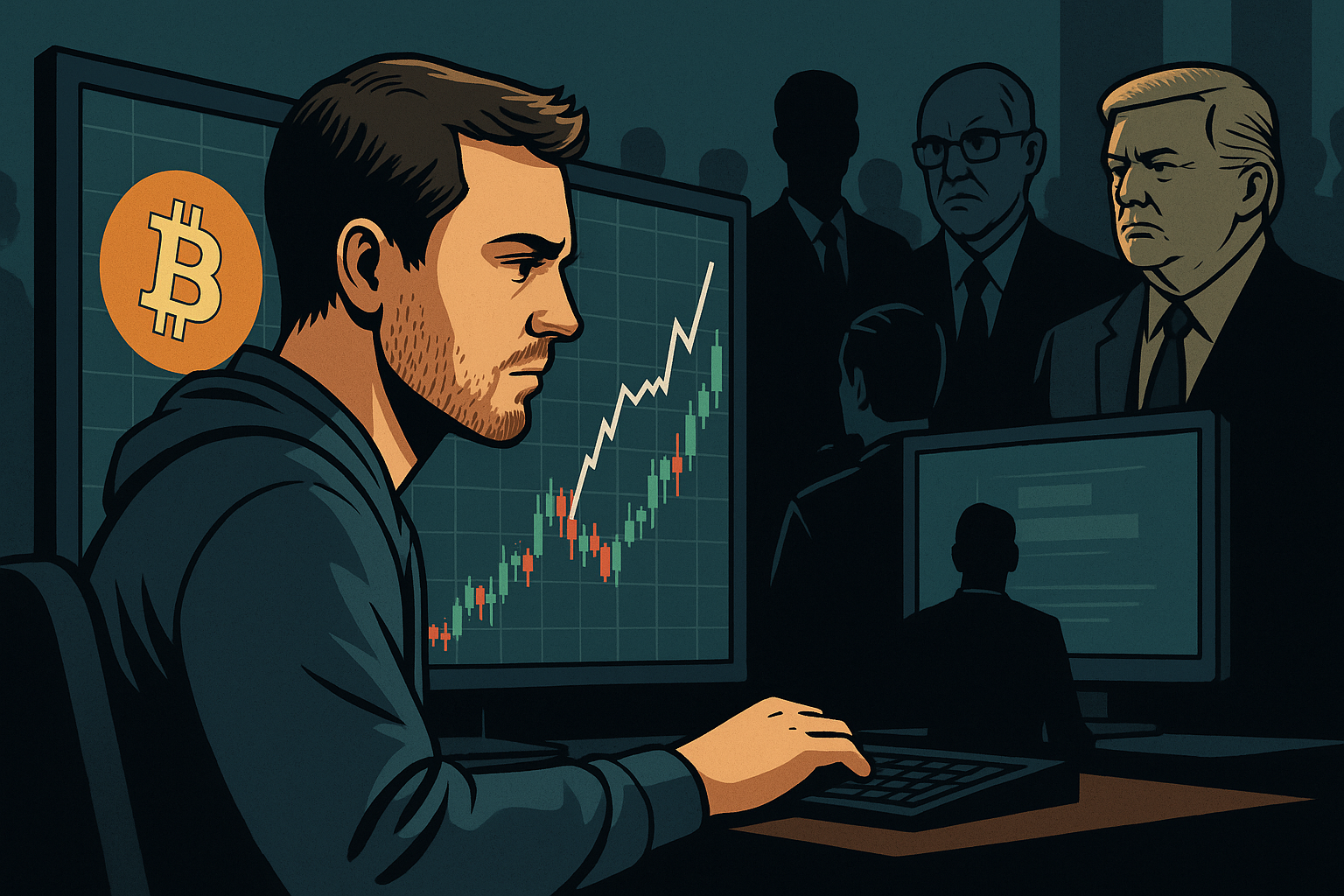 Obični investitor promatra graf Bitcoina dok institucije i fondovi pomiču tržište – priča o tome kako ljudi postaju milijunaši s kriptom.