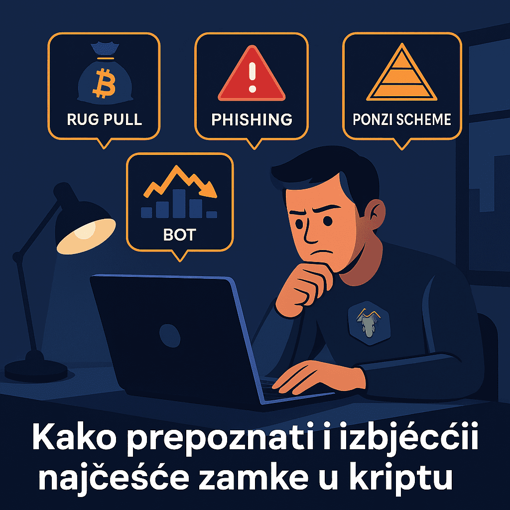Investitor u tamnoj sobi analizira kako prepoznati i izbjeći najčešće zamke u kriptu, uz upozorenja na rug pull, phishing i ponzi sheme