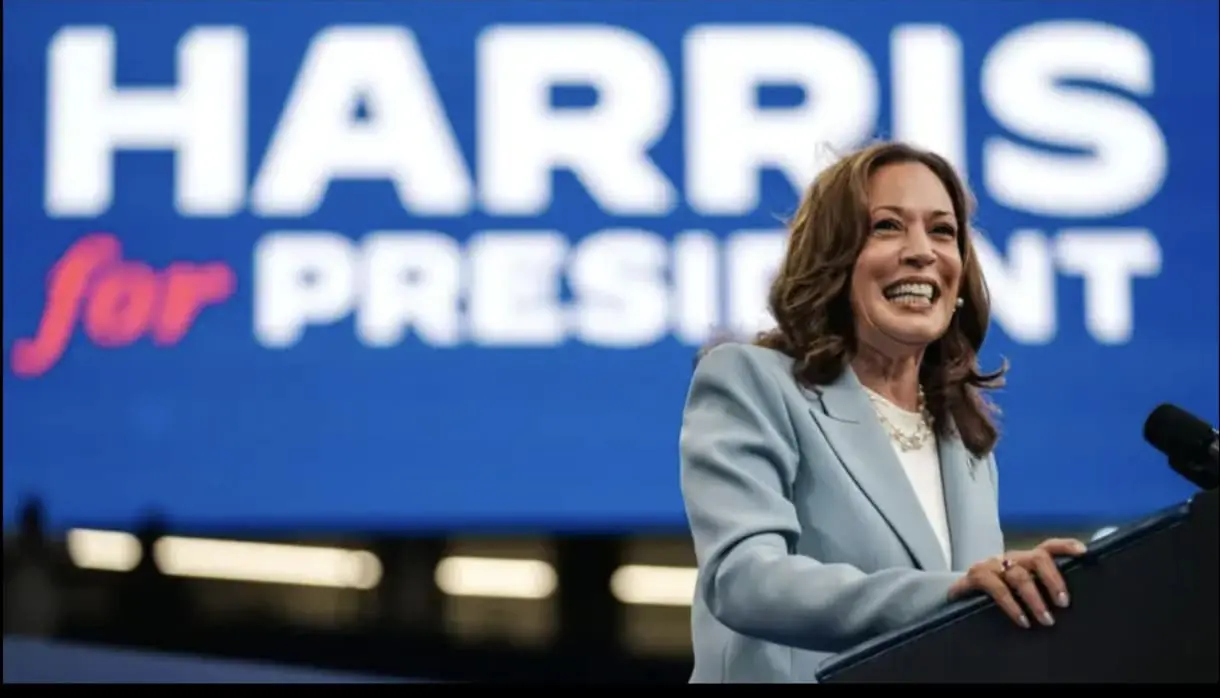 Žena u svijetloplave jakne drži inspirativan govor s pozornice na političkom skupu HARRIS for PRESIDENT. S povjerenjem i entuzijazmom obraća se publici, dok u pozadini dominira natpis s njezinim imenom, stvarajući dinamičnu atmosferu političke kampanje.