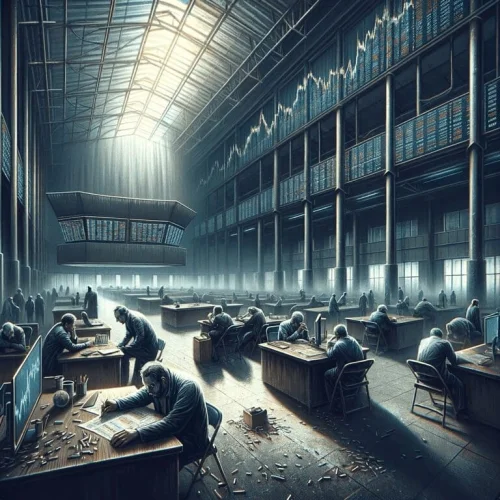 Prostrana i slabo osvijetljena dvorana s visokim stropovima ispunjena je umornim radnicima odjevenim u odijela, koji se fokusirano bave svojim poslovima uz raspršene papire. Ekstremni pritisak prevladava, dok zasloni prikazuju financijske indekse, stvarajući osjećaj tjeskobe i neizvjesnosti.
