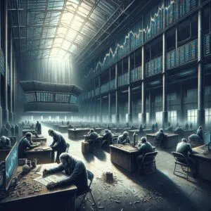 Intenzivna atmosfera financijskog rada u mračnoj dvorani s umornim radnicima.