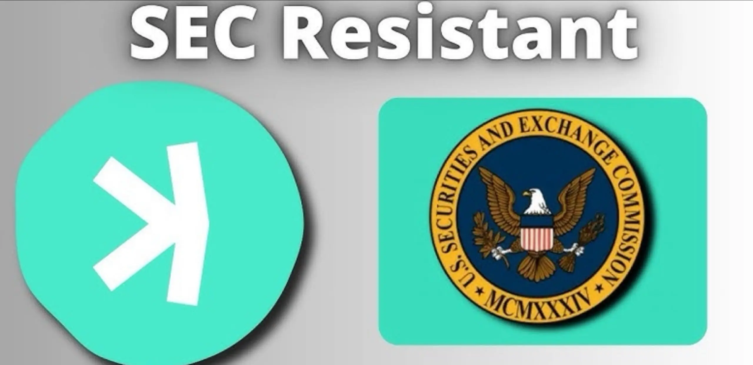Slika prikazuje podijeljeni dizajn s izrazom SEC Resistant u bijelom slovima, naglašavajući otpor prema SEC-u. Lijeva strana sadrži moderan kružni simbol na tirkiznoj pozadini, dok desna strana prikazuje tradicionalni pečat SEC-a.