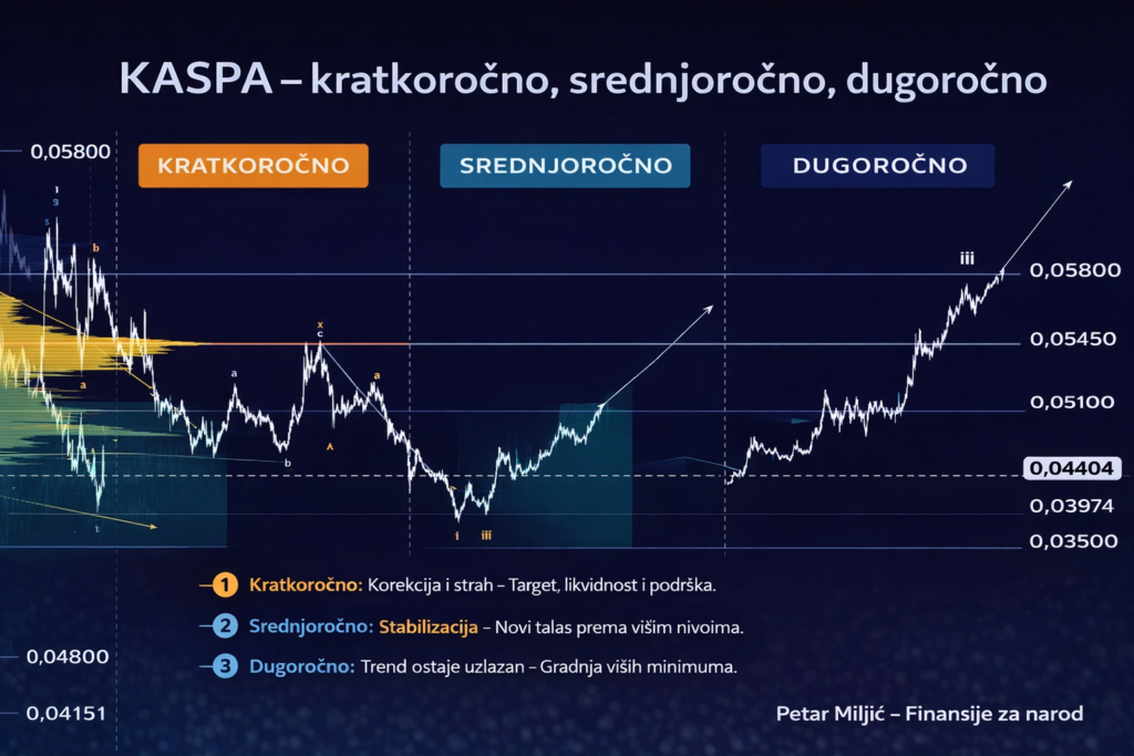 Suština slike, prevedena na “narodni jezik”, glasi ovako: Kaspa je u korekciji koja još može da napravi jedan završni pad prema zoni 0.039–0.040, i tek nakon toga se očekuje stabilizacija i jači uzlazni nastavak ka 0.0466, zatim 0.0515, pa eventualno i više, ako se momentum potvrdi.