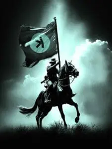 Na slici se vidi usamljeni jahač na živopisnom konju, smješten u dramatičnom okruženju s tamnim oblacima i prolaznim svjetlom. Jahač, s širokim šeširom, drži zastavu s posebnom oznakom, dok konj u galopu izražava snagu i odlučnost u ovoj dinamičnoj sceni.