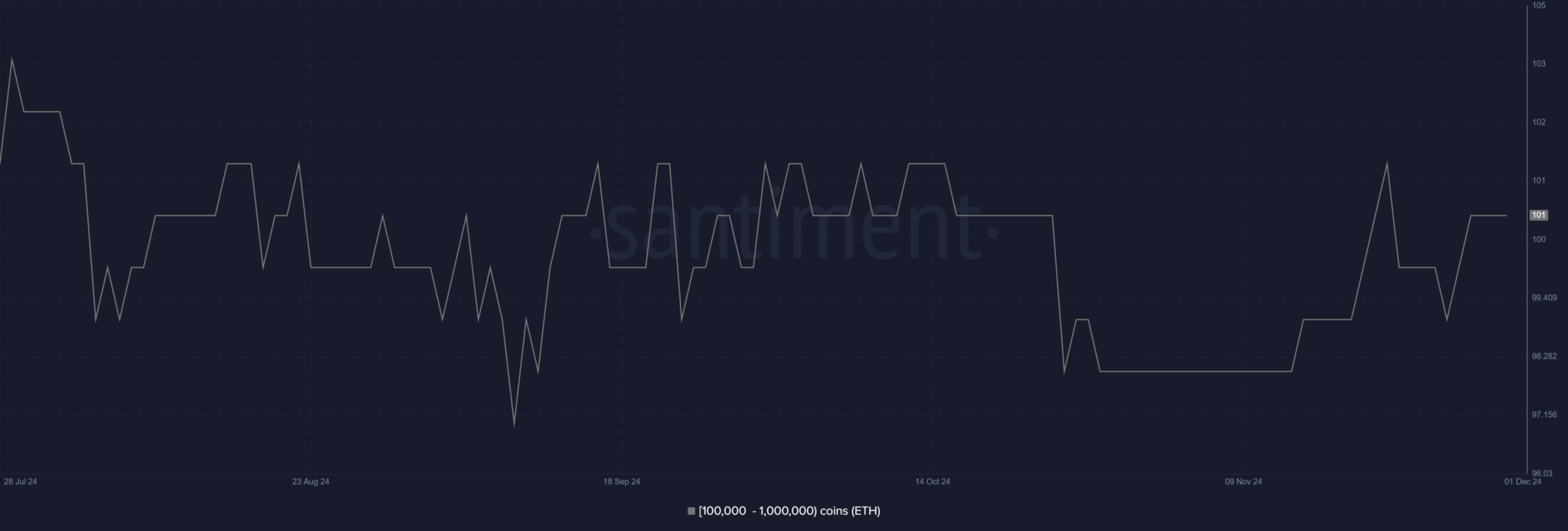 Grafikon prikazuje fluktuacije vrijednosti Ethereuma od 24. srpnja do 1. prosinca 2024. godine. Linija varira između 96,03 i 105, s nizom naglih padova i uspona, a stabilizira se na otprilike 101 krajem studenog, sugerirajući promjenjivo tržišno stanje.