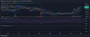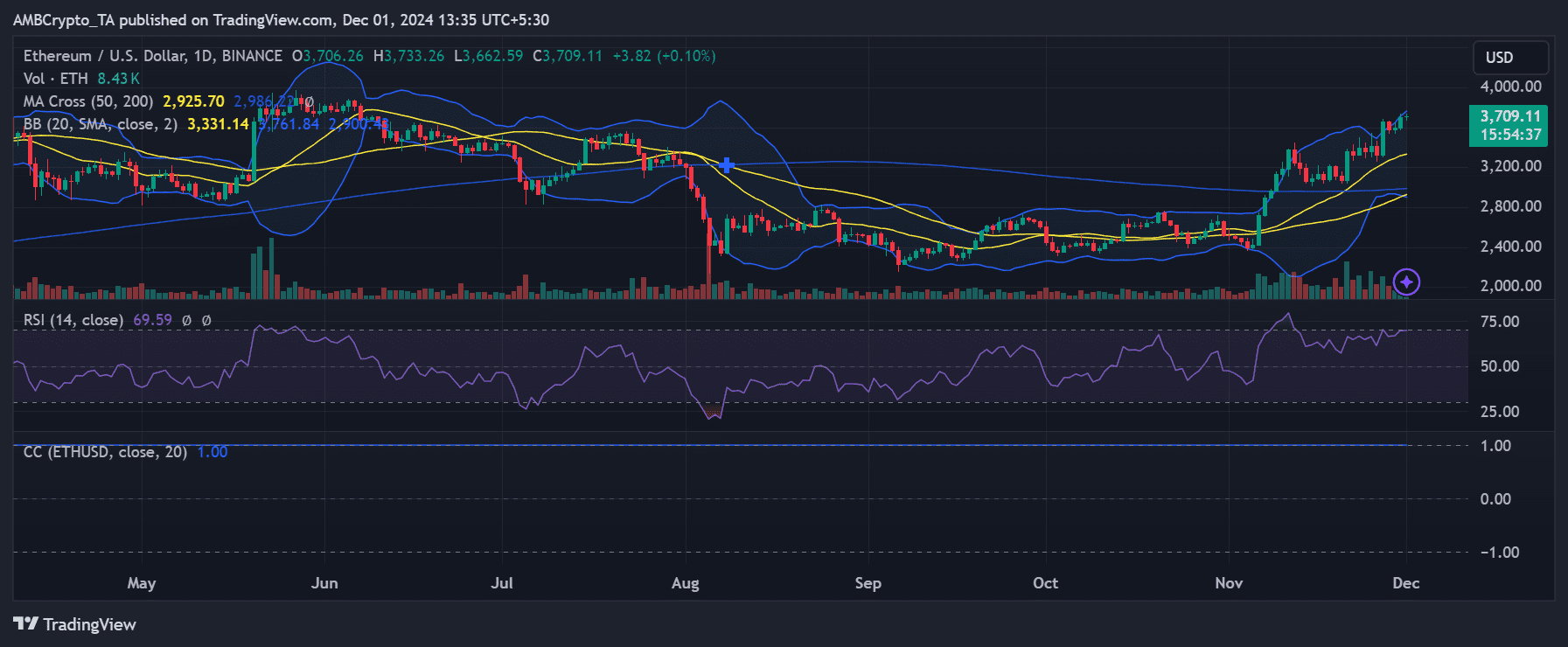 Grafikon analizira dnevne cijene Ethereum (ETH) prema USD za 2024. godinu na Binanceu. Prikazuje candlestick obrasce, pokretne prosjeke, Bollingerove trake, volumene trgovanja te RSI. Trenutna cijena ETH iznosi 3,709.11 USD uz blagi porast od 0.10%.
