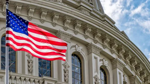 Slika prikazuje veličanstveni Kapitol s neoklasicističkim detaljima, dok se ispred njega ponosno vije američka zastava. Nebo je djelomično oblačno, a svjetlost dodatno ističe arhitekturu zgrade, simbolizirajući snagu i stabilnost američke demokracije.