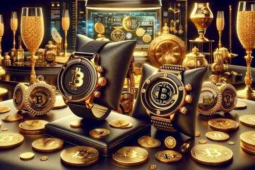 Luksuzni satovi s Bitcoin logom na zlatnoj pozadini, simbol bogatstva i modernih investicija.
