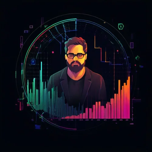 Digitalna umjetnost prikazuje analitičara s bradom i naočalama, odjevenog u tamno sako, uronjenog u svijet živopisnih grafikonâ i digitalnih simbola. Oko njega se prostire dinamična mreža boja i oblika, simbolizirajući spoj tehnologije i ljudske intuicije.