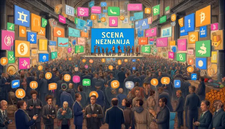 Slika prikazuje živahnu konferenciju posvećenu kriptovalutama, s publikom u formalnoj odjeći koja raspravlja i dijeli plakate s simbolima Bitcoina i Ethereuma. Na pozornici s natpisom Scena Neznanja, panel govornika dijeli ideje o modernoj tehnologiji pred grandioznim ambijentom.