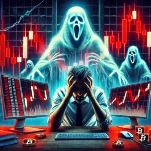 Prikaz muškarca pod stresom za stolom između dva monitora s crvenim financijskim grafikonima i duhovima u pozadini. Sjena tržišnog pada prati osjećaj straha i nesigurnosti, dok su simboli Bitcoina na stolu znak kriptovalutne trgovine.