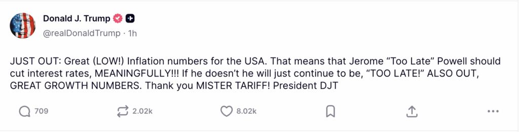 „Izvrsne (NISKE!) brojke inflacije za SAD. To znači da bi Jerome ‘Prekasno’ Powell trebao smanjiti kamatne stope, I TO SMISLENNO!!!“, napisao je Trump, dodajući da je gospodarski rast ostao snažan uz stabilnu inflaciju.