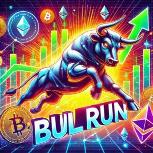 Dinamična slika prikazuje snažnog bika u skoku, simbolizirajući rast na tržištu kriptovaluta. Oko njega su simboli Bitcoina i Ethereuma, uz uzlazne grafikone u zelenim tonovima koji dodatno ističu pozitivne trendove i energiju tržišta.